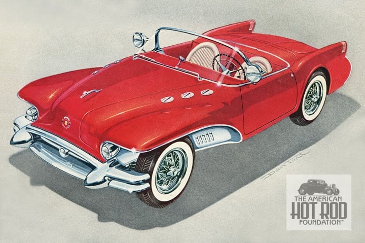 We’re suckers for customs and this illustration (JMC_4344) from the cover of the July 1954 issue of Auto Age Magazine features the work of Dan Todd. The vehicle is the 1954 Buick Wildcat II showcar. The body was constructed of fiberglass that featured flying front wings (fenders) that covered a shortened production car chassis. It even had one of those nailheads under the hood. Way cool.