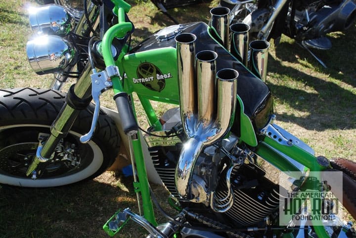 Not far from the Chevy we spotted the wildest ride of the event in our minds and it happened to be a Scoot (most normal folks would call it a Motorcycle). This one was put together by the “Detroit Bros. out of Ferndale Michigan. It featured a 121″ Total Performance powerplant and almost everything on the bike was custom made by the Bros. All I can say is dig those crazy pipes and nice job guys.
