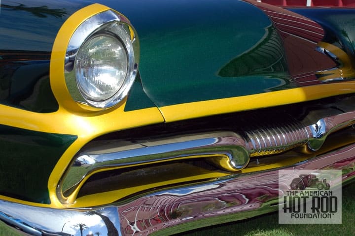 Not far away from the Scoot we spotted another head-turner in the guise of a hardly recognizable ’55 Ford. It wears headlights rings off a ’56 Olds with fenders peaked to match and the grillbar is from a ’55 Plymouth that fits nicely in the reworked front opening. The simple yellow-gold scallops work great with the dark green. All that’s missing is some linework where the colors meet.