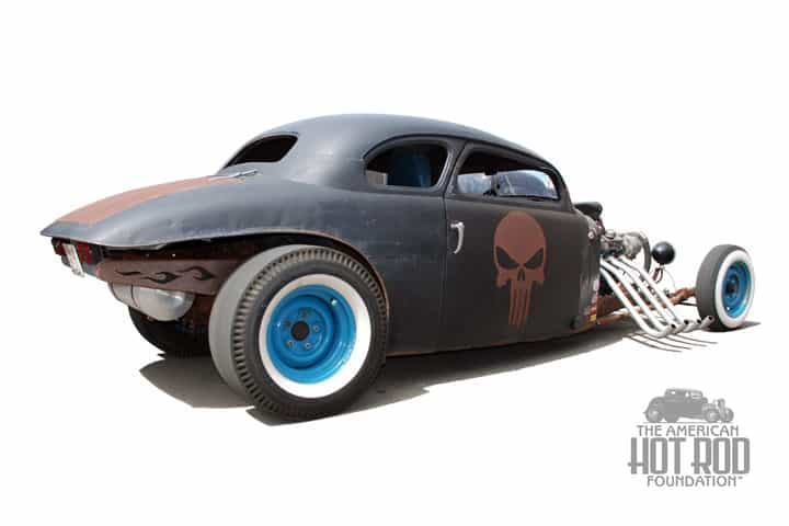 Ratsters keep getting more outrageous all the time and this one piqued our interest. It looks like a ‘40 (most likely Chevy) GM coupe body that underwent some proportion changes. It sits on a more or less conventional chassis with beam axle up front. What’s interesting is the foreword location of the rear axle (kinda like the AFX’ers of the ‘60’s) and the lack of a lower rear body. Looks like innovation is still alive and well. Our bud on the door and the deck lid are au-natural rust while grey-black primer protects? the rest.