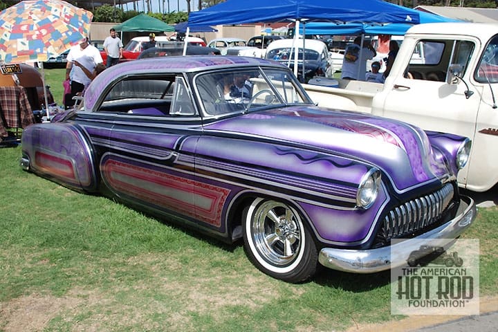 JMC_4349 shows an old custom stand-by, the ‘50-’51 Chevrolet Bel-Air that I will call a Chevy Low Rider. It’s pretty mild in the alts department featuring ‘55 Olds headlight rings and what looks like ‘47-’53 Buick Teeth. What’s amazing is the never-ending wilder and wilder paint schemes that keep showing up on these puppies.