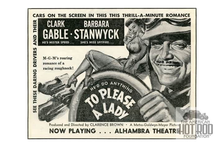 Last week we mentioned that we have been scanning programs for our database. In one of them, we found an advertisement for the brand new racing movie called “To Please A Lady” that starred Clark Gable and Barbara Stanwyck (JMC_1842). It’s from the race program for the Sacramento State Fairground AAA National Championship big car race held on October 15, 1950. For you info junkies, Duke Dinsmore won this 100 mile Champ Car race in the Brown Motor Racing Special.
