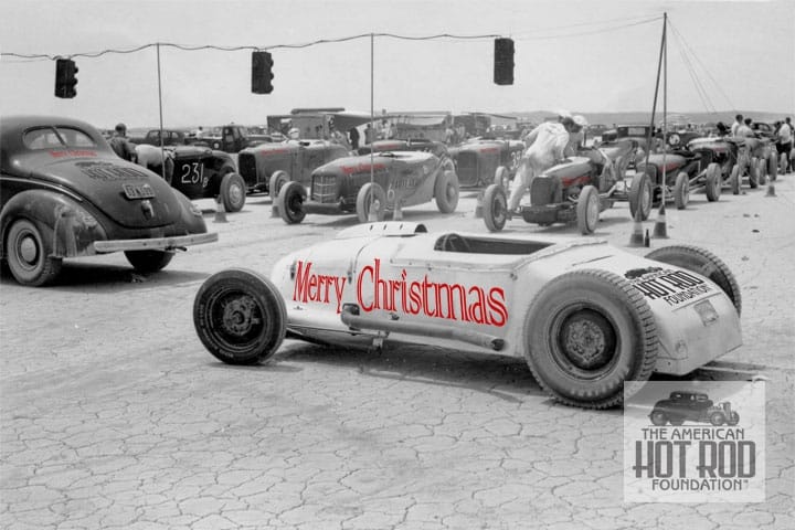 Since it’s that special time of the year we’ve taken the liberty to play around a little with this Glen Barrett supplied Gear Grinders shot so the car numbers referred to below are most likely not there. The T roadster in the foreground belonged to Harold Daigh and his brother Chuck of the Dolphins and is seen at El Mirage in 1949. The Class C Lakester was powered by a 258″ ’40 Merc and fitted with Navarro heads and intake manifold, buddy Clay Smith’s cam and a Chuck Potvin ignition. The car ran 148.29 mph for second in class in July. Harold is seen in his white jumpsuit looking at the no. 21 Class B streamliner Path-Moore. It ran 145.16 mph for first in class. No. 634 to its right is photographer and Carlsbad Oilers member Don Cox’s Class B Lakester. Don ran 108.17 mph. No. 231 is Bill Brilers member Don Cox’s Class B Lakester. Don ran 108.17 mph. No. 231 is Bill Br Reno and became a sports car racer of note. Clem Tebow is the T in C&T Automotive and ran one mean Ardun powered Sprint Car. Doug Hartelt turned into a Master engine builder for dragster and lakes cars. Norm Lean became the head honcho of Toyota of America. Not bad for a bunch of rodder type grease monkeys.