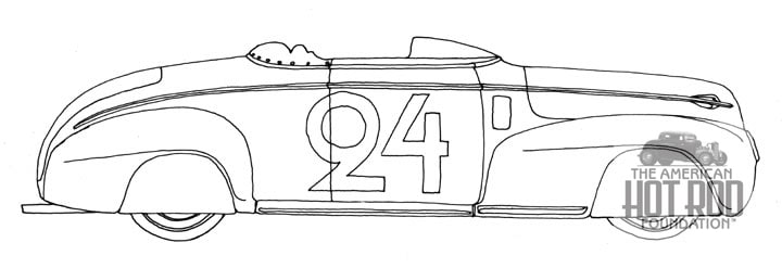To take the modification theme a little further on old Ford and Merc’s, all one has to do is be influenced a little by racing. We only have to look as far as the Dry Lakes and a place called Le Mans for a little inspiration to turn our Ford product into a real flyer (JMC_278). Back in 1972, we did just that with this sketch showing what some skirts all around, a plex bubble on the tonneau, and a French style number on the side ala a Bugatti would do to make a sled look real fast standing still. I can hear those pipes rapping as it’s slowing down right now.