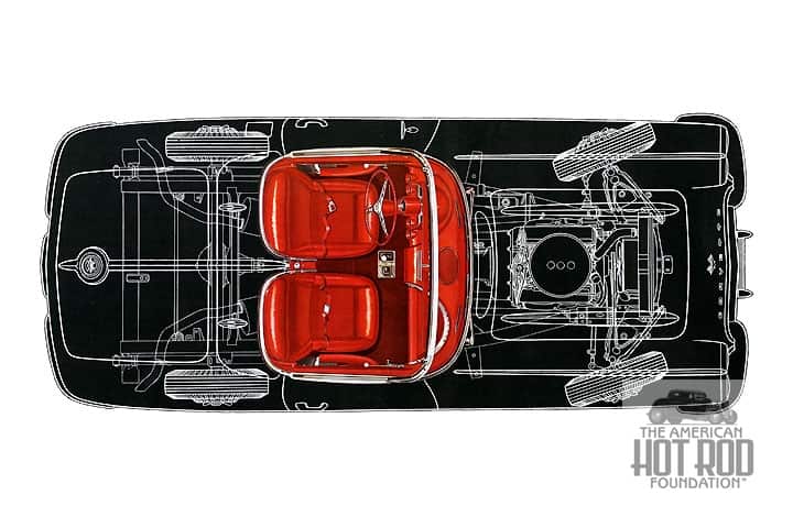 To continue on the plastic car theme for a bit, in ‘61 the styling boys at GM changed the tail on the Vette to get the public ready for the new Sting Ray look in ‘63. Underneath the body was still basically a shortened early ‘50’s Chevy chassis that didn’t know what the words handle or stop meant. This cleaned up illustration (JMC_4878) is from a 1961 Corvette Brochure and shows you the car’s guts.