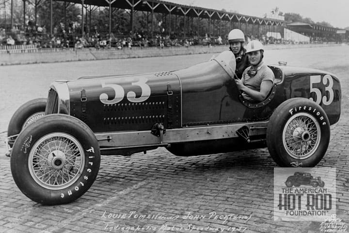 If we go the next step, some all-out race cars were even put on the street back in the day. This Studebaker powered car first showed up at Indy in 1932 and featured a Herman Rigling chassis. By 1937 when this picture was snapped it was still basically unmolested and had the same 336” Studie straight-8 in it. Entered by Phil Sanders’ S.S. Engineering Company as the Sobonite Plastics Special and painted maroon, it was driven by Louie Tomai with mechanic John Peck riding shotgun. They put the car in the race with a speed of 116.437 mph for an 18th place start position and finished all 200 laps for a 10th place finish. In our research, we discovered that Virgil Exner had bought the car in the early ’40s for $500 from Sanders and turned it into a daily driver. Exner played with it for years before he sold the car in ’49. Studebaker, the Company, tracked it down and bought it in ’52.