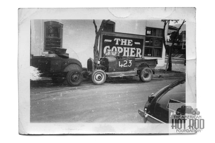 A lot of early-day rods were also used as daily drivers by their owners and that got us to looking for others of the same ilk. This 1941 shot shows Milers member Bob Corbett’s banger powered roadster-pickup parked next to the Gopher Grill (DOT_673). Out came our old phone book so we could tell you that the eatery was located at 7722 Santa Monica Boulevard. That’s just four blocks east of Fairfax on the corner of Spalding and within a half-mile radius of about half a dozen other pre-war dry lakes race clubs. Bob’s car is wearing its race number from the August 24 S.C.T.A. lakes meet held at Muroc. No speed was listed in our results.