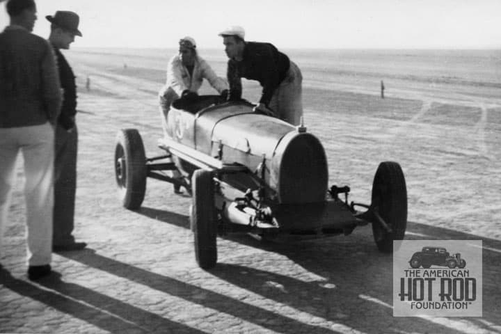 If you think these foreign jobs have no place in the hot rod world you’ve missed the boat. Our next shot shows car number 331 run by Knox Allen of the Lancers (HEY_054). He teamed up with Bob Cox and someone named Daniel during the 1940 lakes season with this Winfield-headed banger-powered Modified at the May 19th and August 18th races. The year before Knox had driven the same car off course at Rosamond and into a barbed wire fence that caught him in the neck. Luckily he survived. The grill shell and radiator are off one of those funny French cars called a Bugatti like “Bunny’s” above. No speed is Known.