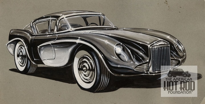 Leave it to rodder types to have a little fun at the expense of serious stylists (JHC_089). This Joe Henning drawing appeared in Rod & Custom Magazine back in September 1957 and was called the B.A.T. 34.5 or Belfriano Automotica Terrifica. It was a spoof on the now famous and million-dollar series of Alfa-Romeo design exercises created by Bertone that also used B.A.T. (Berlinetta Aerodinamica Tecnica) for their names. We need a big garage now!