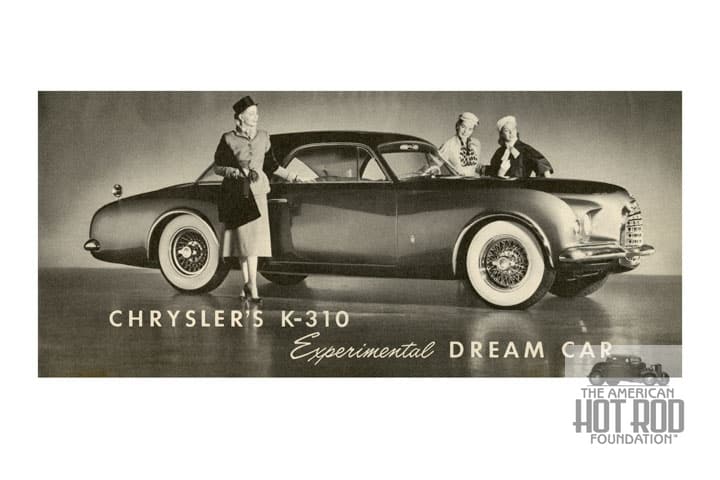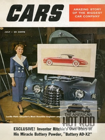 We’re always rummaging through our stash of old magazines trying to find long lost tidbits of info. Up popped Volume 1, Number 4 of Cars (JMC_4632), The New and Different Automotive Magazine that was brought to us by the gent who created “Captain Billy’s Whiz Bang” about a century ago and built an empire called Fawcett Publications. On the cover of this July 1953 issue is Chrysler engineer Lucille Pieti showing of the svelte body lines (easy guys) of the Virgil Exner designed, Ghia bodied, K-310 Sport Coupe. In our files, we also just happened to have a copy of a 1952 Auto Show giveaway of the same car (JMC_3722).