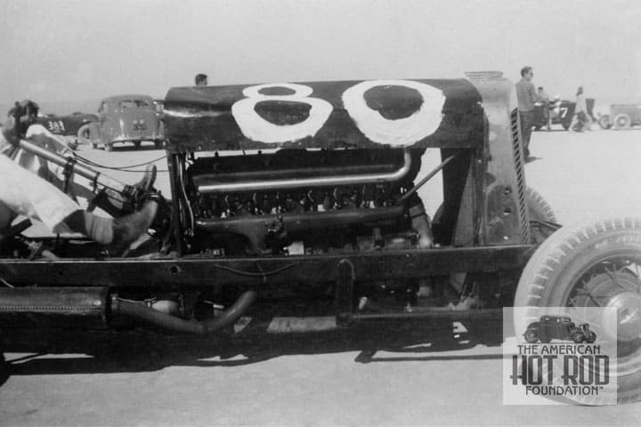 Here’s another weirdo car that ran at the lakes in 1941 (LWJ_042). This one belonged to Hollywood Throttlers club member Ted Cannon and ran in the Unlimited Class. The engine is a Marmon V-16 that displaced 490.8” and put out 200 hp in stock form. Yes, it was quick, on August 24th Ted “only” ran 128 mph. The next month he ran a slower 113.49 mph. Note how well the driver is not protected. After the war, Ted set up shop in North Hollywood and became a driveline specialist. In his spare time, he built chassis’ for Doc Boyce-Smith’s Glaspar cars and his own racing sports cars.