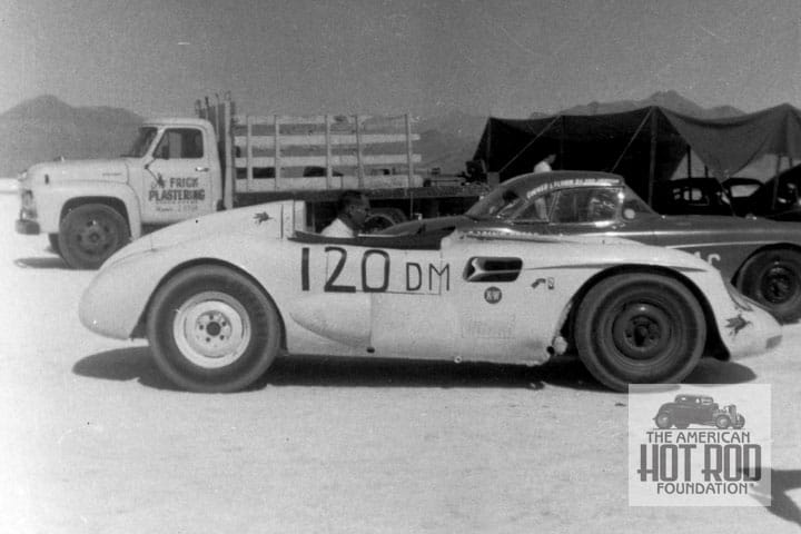 We also dug out a shot of this “other kind” of rod (CWC_042). Ak Miller entered the Caballo de Hiero Mk II (every car had a name in the old days) in Class D Modified Sports Car at Bonneville in 1957. It had a 395″ Chrysler under the hood and ran 177.42 mph for second in class. It was also featured on the cover of the April ‘57 issue of Hot Rod Magazine and was built to run in the Mille Miglia sports car race in Italy on May 12 of that year. Miller and Doug Harrison ran it as car no. 524 and dropped out with a broken exhaust. Next to it is George Hansen’s Vette no. 44 that ran in Class C Sports Car. A 340 ” Chevy V8 powered the car to a first in class with a speed of 144 mph and set a record at 144.322 mph.