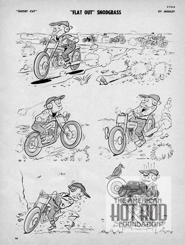 We were doing some research on early Motorcycle LSR racing this week and we’re looking through the September ‘50 issue of Cycle that had a story on the bikes on the dirt at Rosamond Dry Lake. In the back, we ran across one of Tom’s other famous cartoon characters “Flat Out Snodgrass” (JMC_4637). Hope you enjoy it as much as we do.