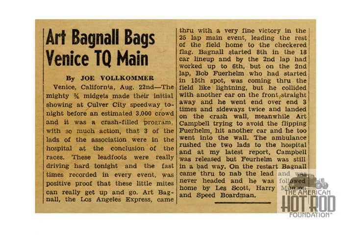 Another cool package via the old Post Office this week came from our friend Doug Stokes who’s the PR Guru out at Irwindale Speedway. Inside it was some priceless goodies that will help fill a gap in a form of racing that started in Southern California on November 26, 1949, at a little bull ring called Lincoln Park Speedway that is way off the radar in the motorsports world. Ever heard of T.Q.M.R.A.? That stands for Three Quarter Midget Racing Racing Association or TQ’s for short. We’ve only run across a couple of pictures of these mighty mite’s in the last decade so what a find! Thanks, Doug.