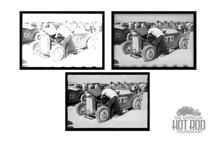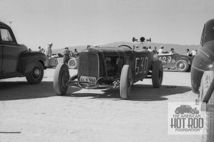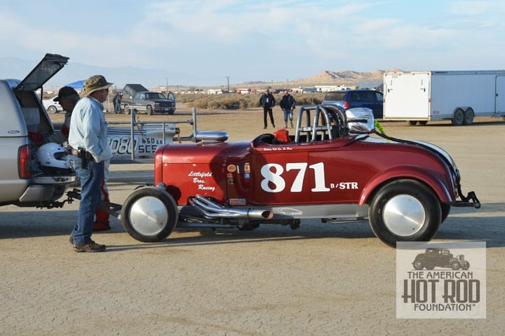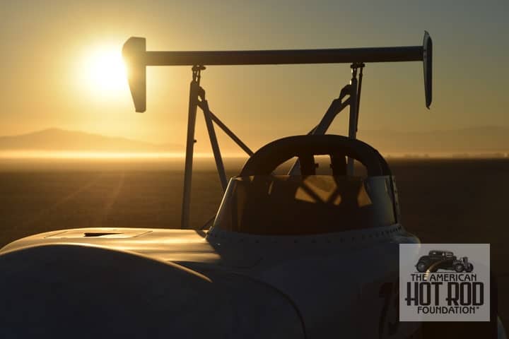 Let’s head off to El Mirage now. JMC_4493 shows you one of the great drawing cards to that little old dry lake. We see the sun rising Saturday morning before the S.C.T.A. races began. The car is Dennis Mariani’s beautiful Modified Roadster. Dennis didn’t have any luck on Saturday, but on Sunday he went on to up the Class E Blown Gas Modified class Record and went home with a smile on his face.