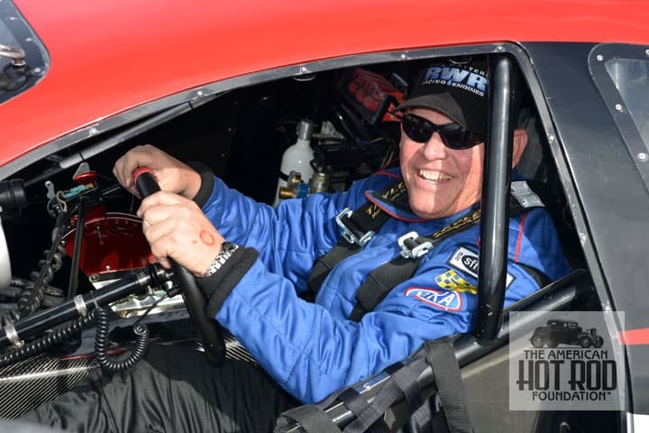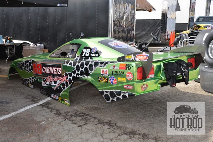 It’s always fun to visit the pre-stage are and let the cars come to you instead of having to walk up and down miles of pit roads. JMC_4490 was towed up with a little quad right when I arrived so snapping started at once. John Edwards from LaVerne, CA gives us a big smile after having just climbed into his number 610 Class C/AA Dodge before taking his first lap on Thursday. The body replicates a ’99 Neon and is powered by a 374″ Dodge. It’s sponsored by the Edwards Brothers & Watters.