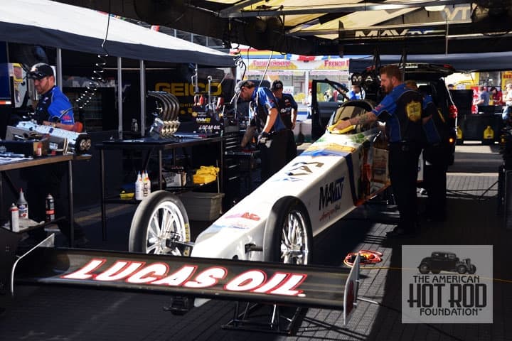 After hanging around staging for a while it was time to visit the hot shoe’S pits. After getting one’s fair share of nitro whiffs funnys warmed up we spied the winner of the 2012 Auto Club Finals pit and made a b-line for it. JMC_4492 presents Brandon Bernstein ride as the funnys warmed up we spied the winner of the 2012 Auto Club Finals pit and made a b-line for it. JMC_4492 presents Brandon Bernstein’s ride for 2013. We capture his crew getting the ’13 Hadman chassis all spiffed up. The blower and engine were still undergoing a little once-over before going out to qualify that afternoon. MAV TV is the entrant. We’ll put more of the shots into the Photo of The Day section.