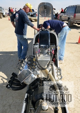 The best part of S.C.T.A. racing is it’s the playground for the unusual. Long-time drag racer Al Eshenbaugh brought his Steinegger & Eshenbaugh 4-cylinder Hemi-powered lakester to Mirage to have a little fun (JMC_4496). The former Hemi-V8 motorsports one cylinder head, a special 4-cylinder crankshaft, and a plate over the un-used cylinders in the right bank. The plugs in the right bank fire because Al runs an 8-cylinder mag. Earlier in the year, he had a banger Toyota in the car running on Nitro. Go Al.